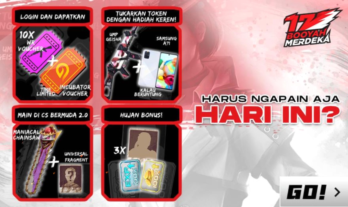 1131036 followers gamestoys. Garena free fire indonesia. Untuk mendapatkan hadiah smartphone pengguna hanya perlu main pada tanggal 17 agustus 2020. Eventually players are forced into a shrinking play zone to engage each other in a tactical and diverse environment. Selain itu pemain juga berkesempatan mendapatkan berbagai hadiah in game yang terdiri dari legend gun skin ump geisha red keffiyeh dan surfboard maniacal chainsaw. Yuk ikutan event booyah merdeka dari garena free fire.