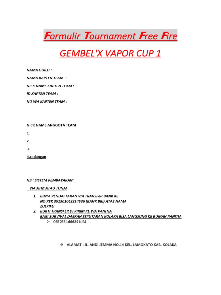 Formulir pendaftaran turnamen free fire. Turnamen metaco max alpha series. Yap di akhir tahun 2019 ini garena free fire akan kembali memilih player yang ingin dinobatkan sebagai pro player diantara sekian banyak peserta. Adalah salah satu turnamen free fire tertinggi yang ada di indonesia. Free fire indonesia masters atau ffim 2020 spring. Sobat gamers yang ingin mengisi waktu luang selama melakukan isolasi mandiri di rumah masing masing bisa mendaftarkan diri dengan mengisi formulir ini. Online registration forms make it easy to plan your next event such as conferences workshops or classes.