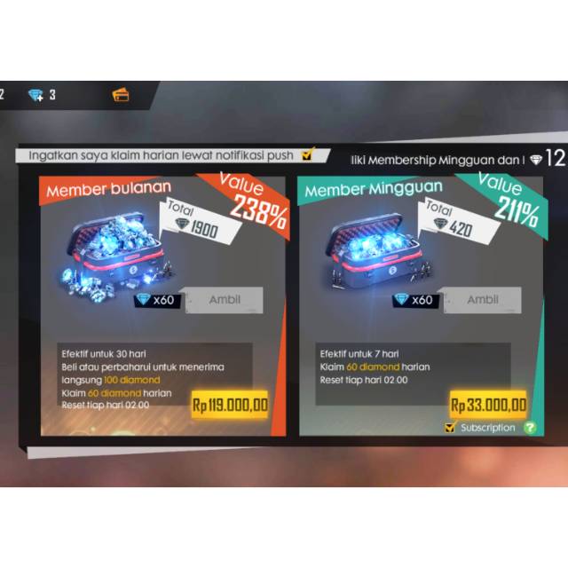 Harga membership mingguan free fire. Free fire member mingguan 60 diamond. Free fire member mingguan untuk mengetahui user id anda silakan klik menu profile di kiri atas user id akan terlihat di bawah nama karakter anda nanti akan. Bisa digunakan ios dan android. Free fire battlegrounds menghadirkan permainan third person shooter tps bertema battle royale ke perangkat seluler. Jual beli game online aman dan murah di itemku. Jual beli game online aman dan murah di itemku.