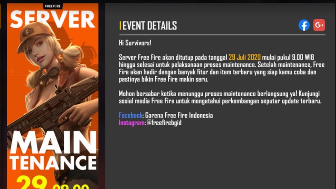 Garena telah resmi mengumumkan free fire akan mengalami maintenance server rabu 1112. Sampai kapan server ff ditutup karena maintenance free fire mei 2020. Rabu 161019. Pastinya garena sedang melakukan update pembaruan pada game free fire. Yang pasti bila terdapat update ff maka banyak gamers yang menanyakan sampai kapan maintenance free fire tersebut berlangsung yang pasti untuk jamnya sendiri mulai dari jam 1100 wib dan untuk masalah jangka waktunya sendiri saya tidak bisa menebak apakah lama ataukah sebentar. Maintenance free fire ff 11 desember update patch terbaru pukul 1000 wib sampai kapan.