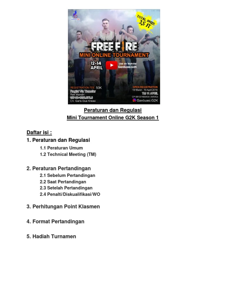 Peraturan turnamen free fire. Tidak hanya itu saja kabarnya pada turnamen master indonesia ffim2 free fire garena ini sangat ketat sekali panitianya pun terbilang sulit untuk dinegoisasi jika ada peserta yang menyalahi aturan main. Garena free fire adalah game survival di mana terdapat 50 pemain yang terdampar di sebuah pulau terpencil dan saling menjatuhkan satu sama lain. Fase qualifier grand final g. Free fire terdiri dari 2 fase yaitu. Metaco online tournament. 0 semua anggota tim harus membaca dan siap mengikuti regulasi dan peraturan turnamen 0 penggunaan program ilegal dalam bentuk apapun akan dikenakan hukuman diskualifikasi 0 map yang dipakai untuk fase.